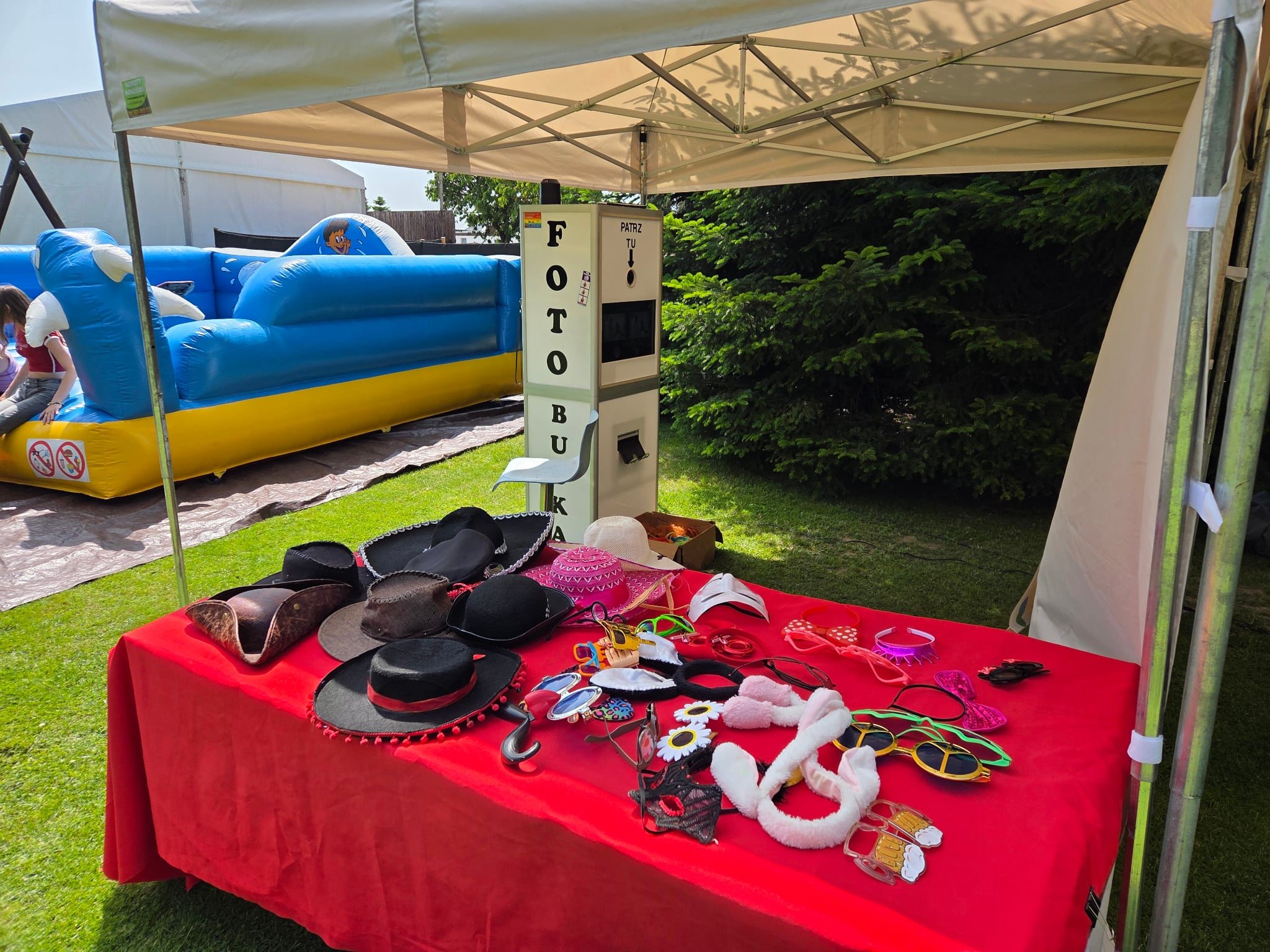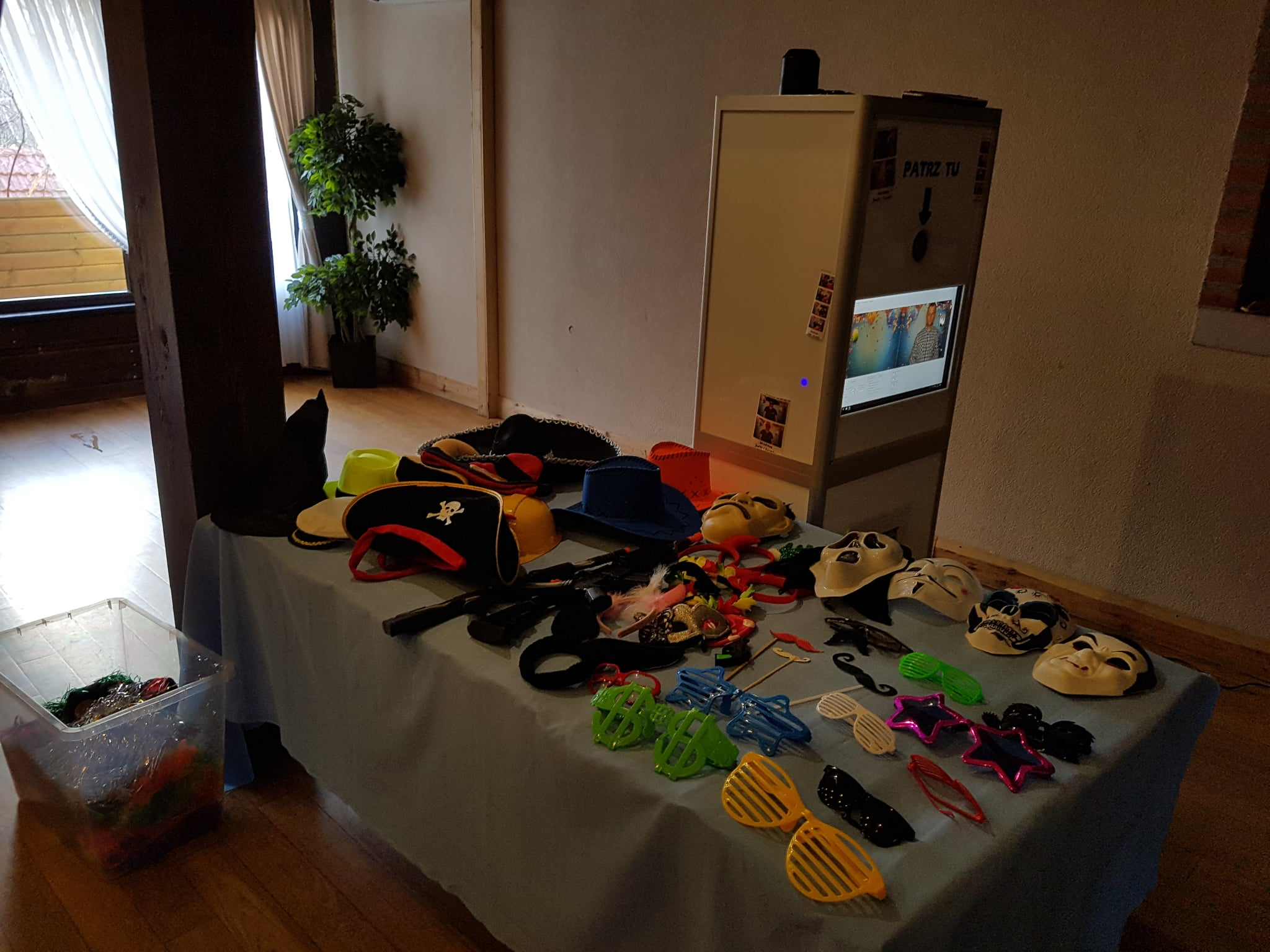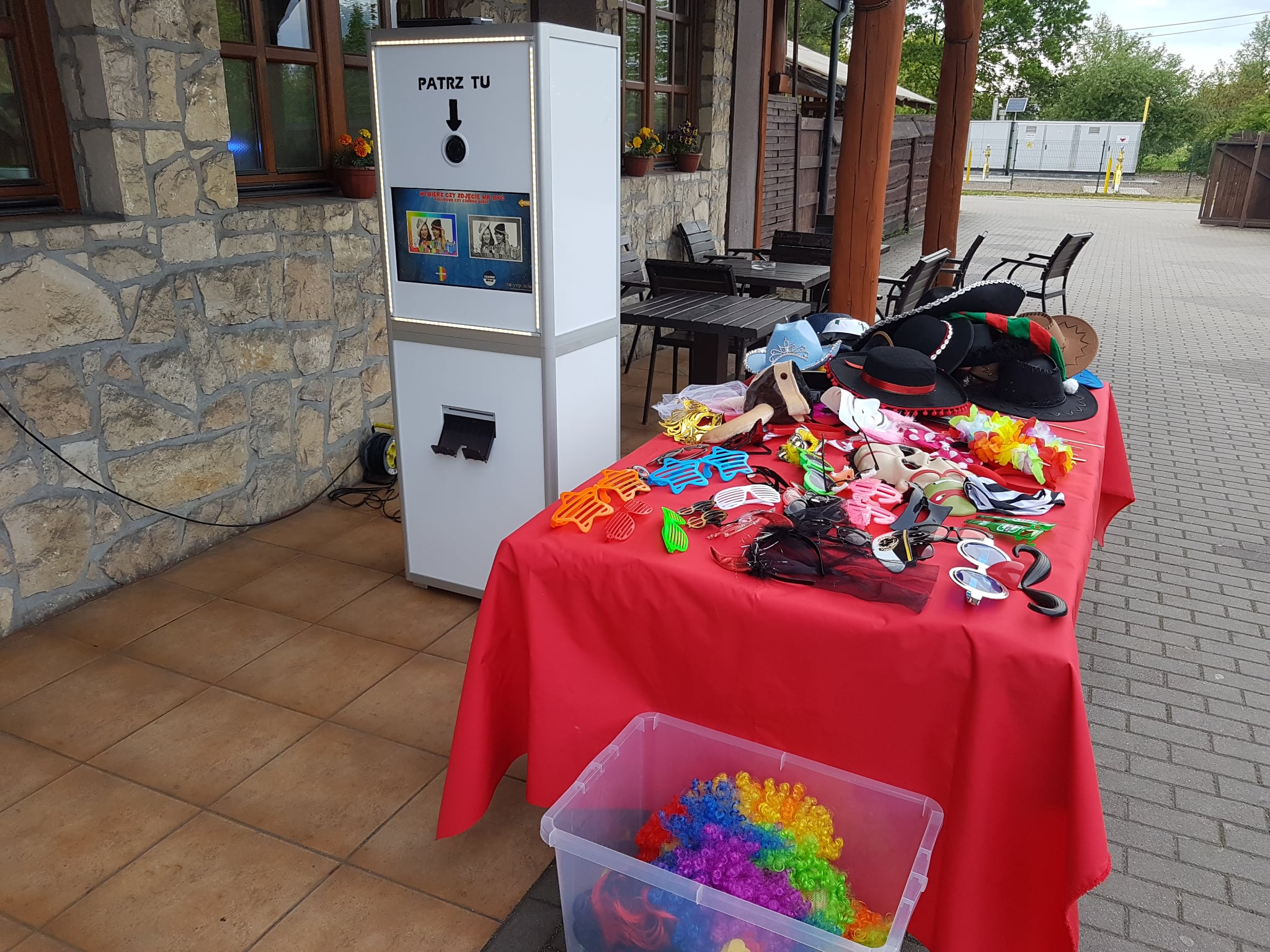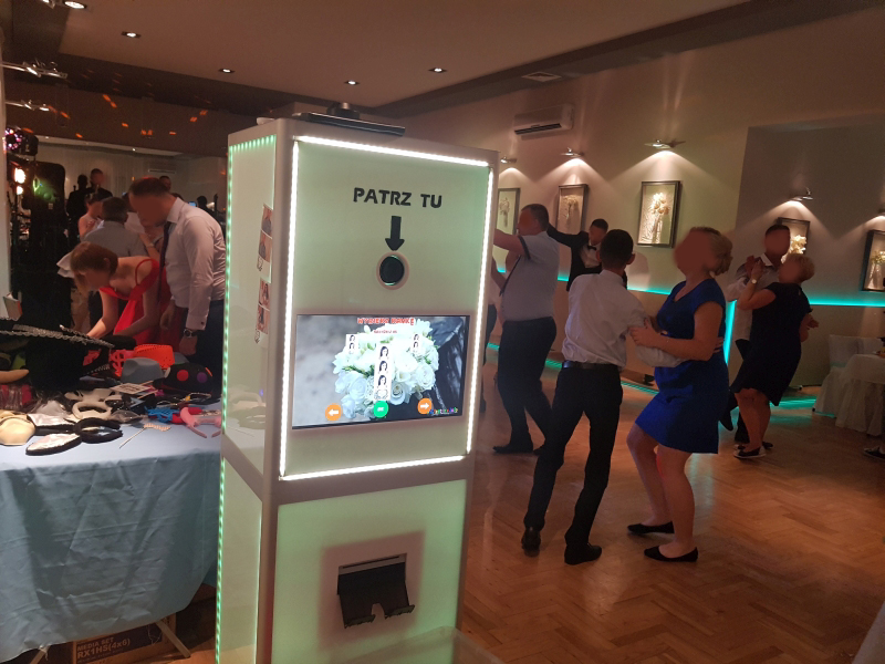 Klasyczna fotobudka. Robisz trzy lub cztery zdjecia, a fotobka automatycznie je drukuje na miejscu. Mamy maski, okulary oraz wiele innych akcesoriow.